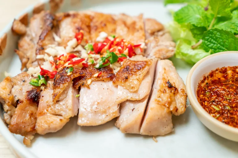 Grilled Chicken is a classic Isan dish proudly presented at Nong Khai Beer House. Carefully selected chicken is marinated with a special blend of Thai herbs and spices, including garlic, coriander roots, black pepper, and seasoning sauce, then grilled over charcoal until the skin is crispy and aromatic, while the meat inside remains tender and juicy. It is served with a spicy jaew dipping sauce and a milder, sweet-and-spicy chicken sauce, accompanied by fresh vegetables in authentic Isan style. Available as a half or whole chicken, this dish is perfect for pairing with hot sticky rice or as a main dish for any gathering.