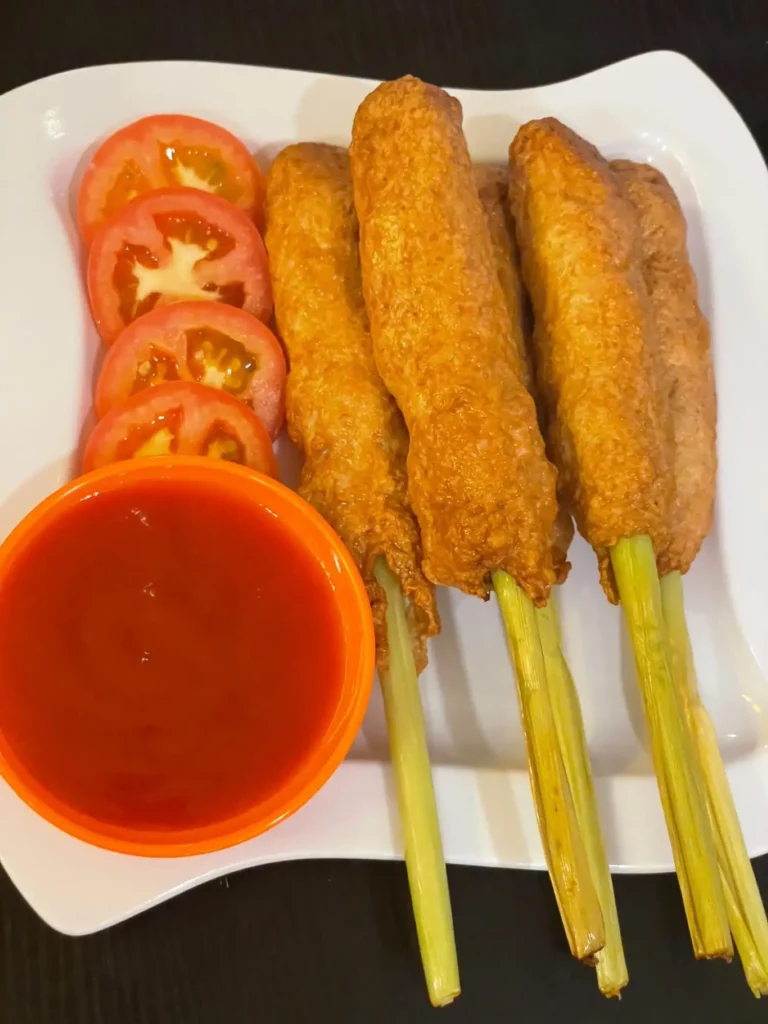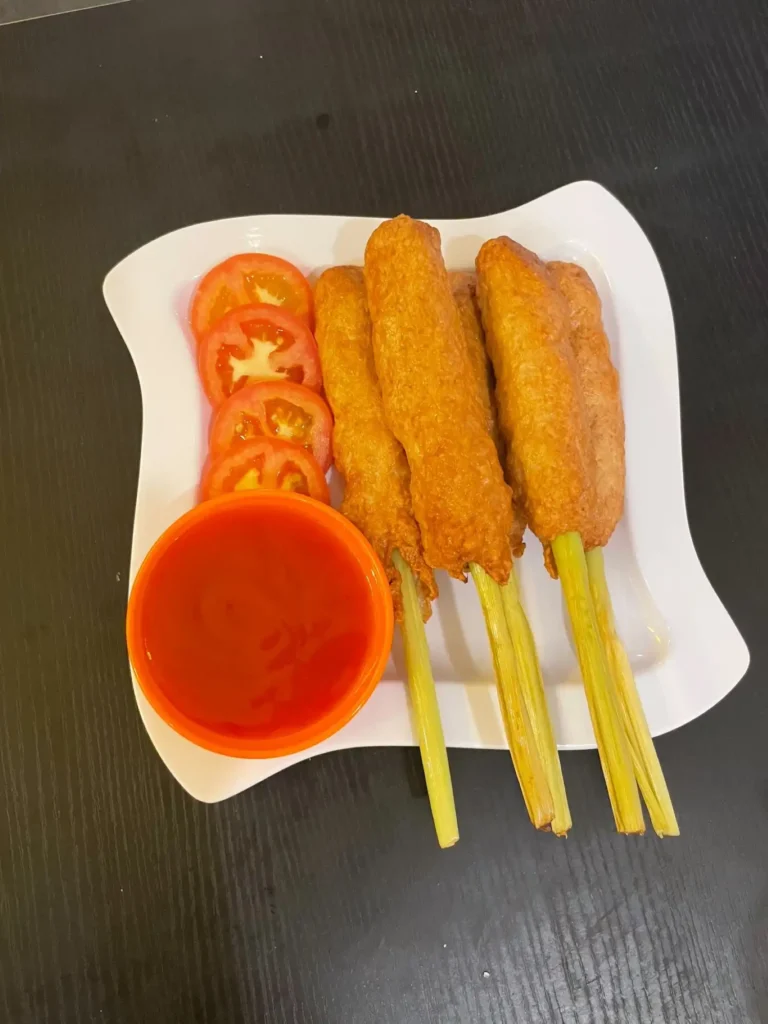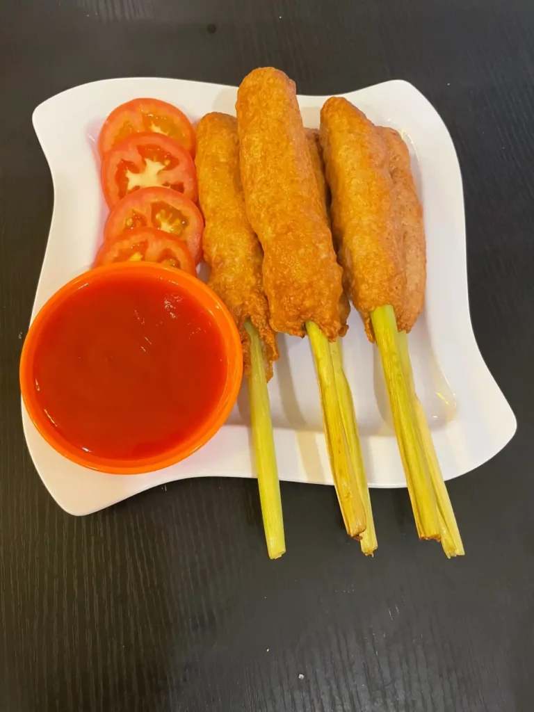 Lemongrass-Wrapped Pork – Tender pork marinated with aromatic spices, wrapped in fragrant lemongrass, and grilled to perfection for a delightful and well-balanced flavor.