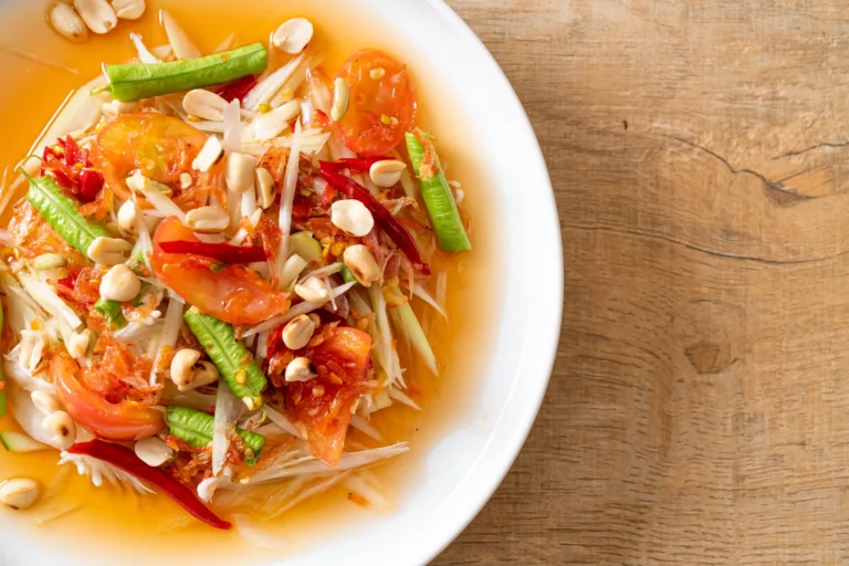 Som Tum Thai – A bold, flavorful dish with a perfect balance of sour, spicy, sweet, and salty. Made with freshly shredded papaya, bird’s eye chilies, garlic, and lime juice, and enhanced with palm sugar and fermented fish sauce for an authentic Isaan taste. Topped with roasted peanuts and dried shrimp, this dish delivers a perfect crunch and a burst of flavors in every bite.