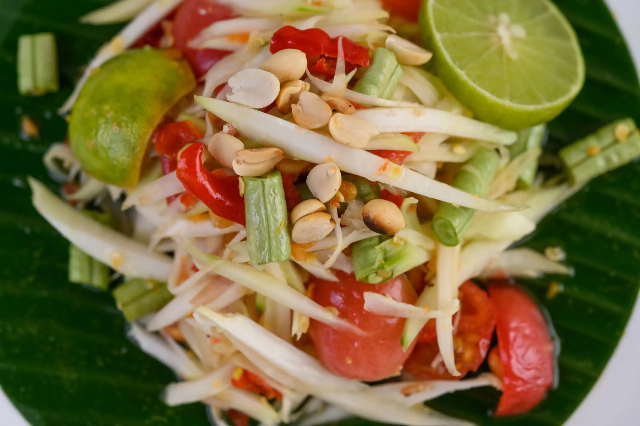 Som Tum Thai – A bold, flavorful dish with a perfect balance of sour, spicy, sweet, and salty. Made with freshly shredded papaya, bird’s eye chilies, garlic, and lime juice, and enhanced with palm sugar and fermented fish sauce for an authentic Isaan taste. Topped with roasted peanuts and dried shrimp, this dish delivers a perfect crunch and a burst of flavors in every bite.