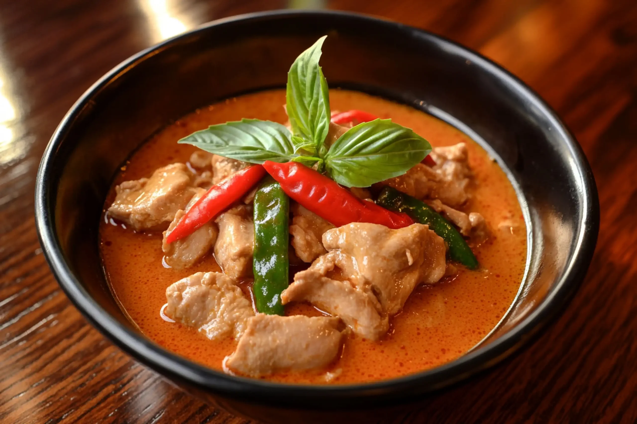 แกงเผ็ดหมู (Red Curry with Pork – Kaeng Phet Moo) เมนูแกงไทยสุดจัดจ้านที่ Nong Khai Beer House ใช้กะทิสดเคี่ยวจนหอมมัน คลุกเคล้ากับพริกแกงแดงสูตรเข้มข้นที่ให้ทั้งความเผ็ด หอม และมันลงตัว เติมความอร่อยด้วยเนื้อหมูเด้งๆ รสชาติกลมกล่อม พร้อมผักสดและใบโหระพาที่เพิ่มความหอม เสิร์ฟร้อนๆ พร้อมข้าวสวย เป็นแกงที่เผ็ดจัดจ้านแต่ละมุน เหมาะสำหรับผู้ที่หลงรักรสชาติแกงไทยแท้