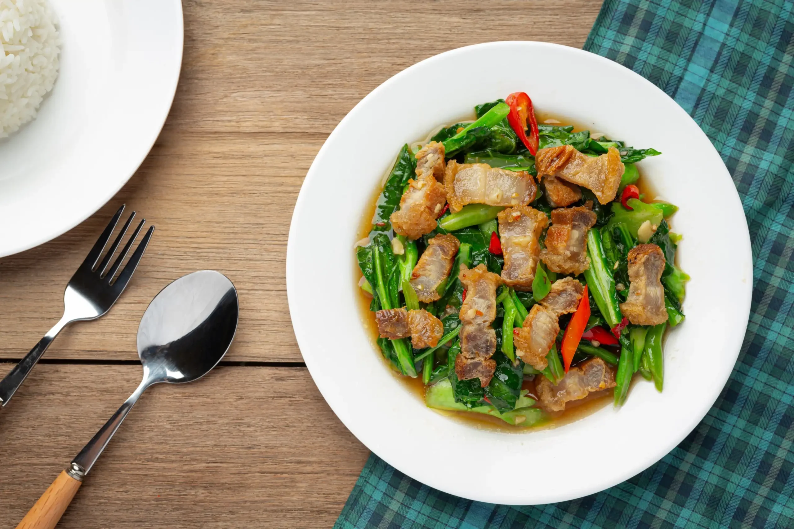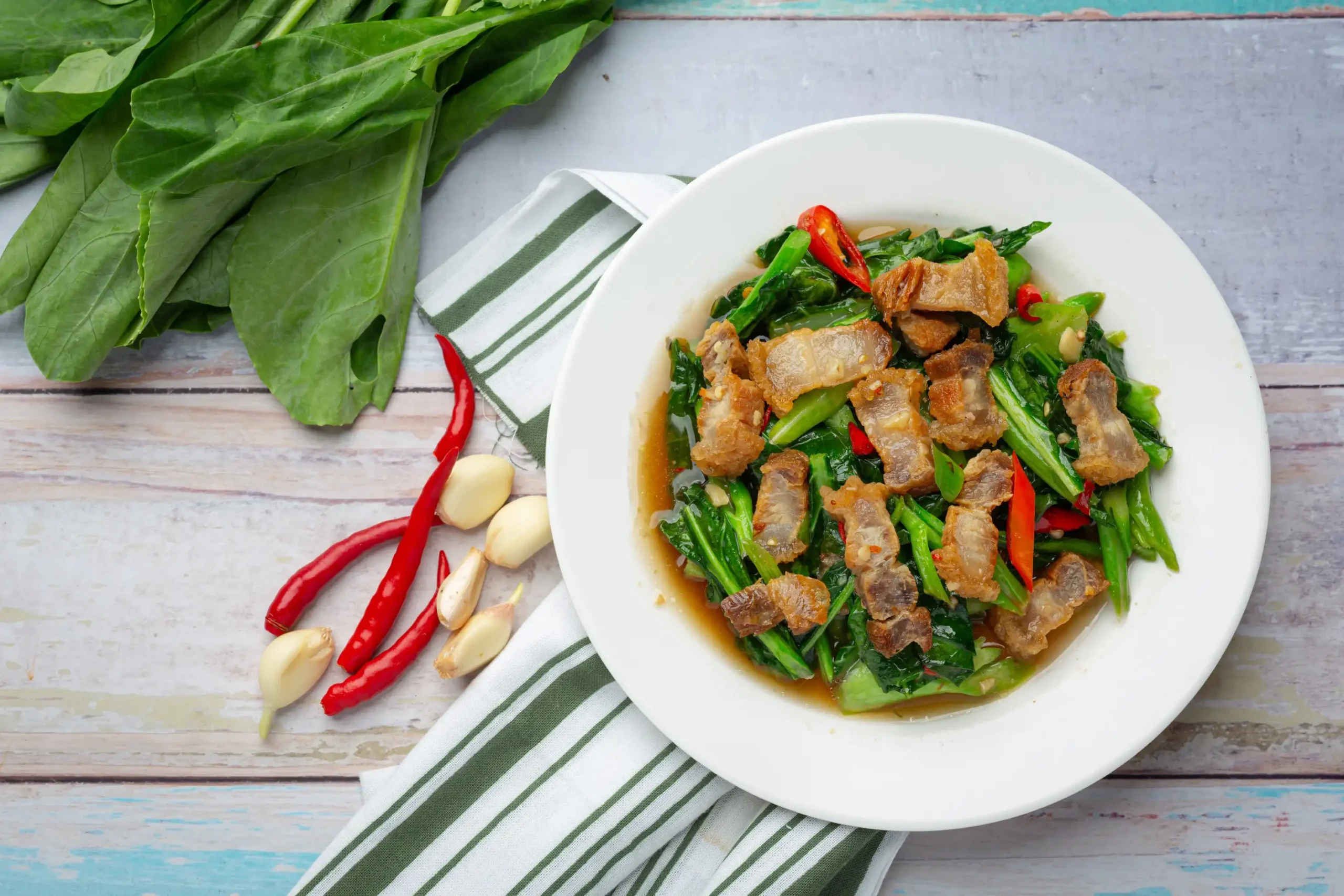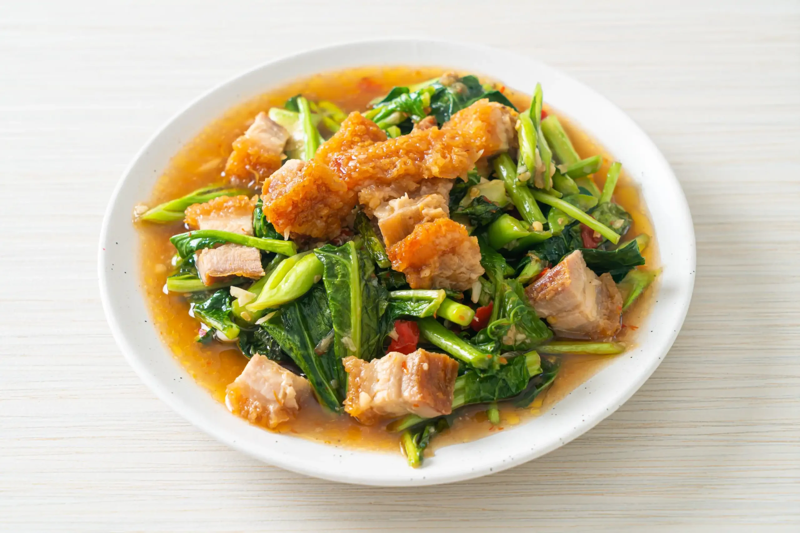 ผัดคะน้าหมูกรอบ คะน้ากรอบสด ผัดไฟแรงกับหมูกรอบหอมมัน รสกลมกล่อมเข้มข้น